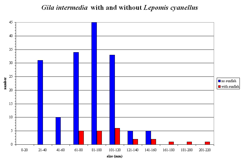 The average size of Gila intermedia above the falls was 71.2 mm (N = 163), below the falls it was 112.7 (N = 23). The average above the falls would have been much lower if we had included all the chubs that were <20 mm that we did not measure (to avoid killing them).