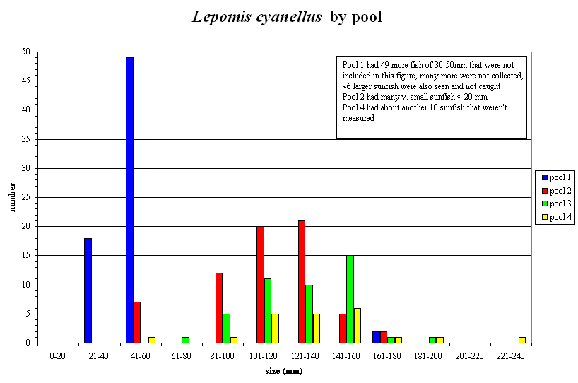 Interestingly, in pool 1 the size classes of Lepomis cyanellus were skewed to relatively smaller fish, within only a few relatively large fish being present. Presumably this is due to their mass removal in 1999, although this seems like a very long time lag for recruitment not to fill in the missing size classes. The presence of large numbers of very small (<20 mm) L. cyanellus in pool 2 seems attributable to the dense cover of nitella around the pools margins.